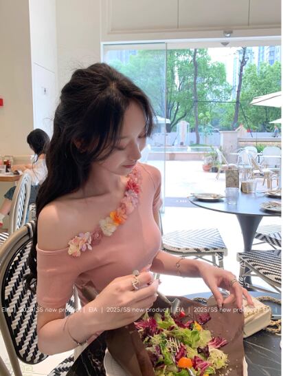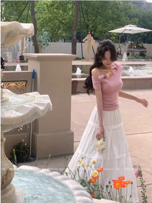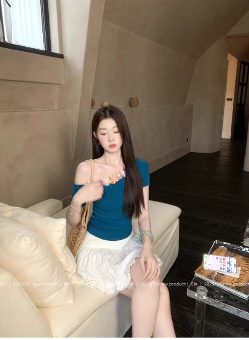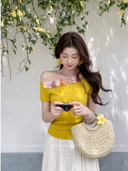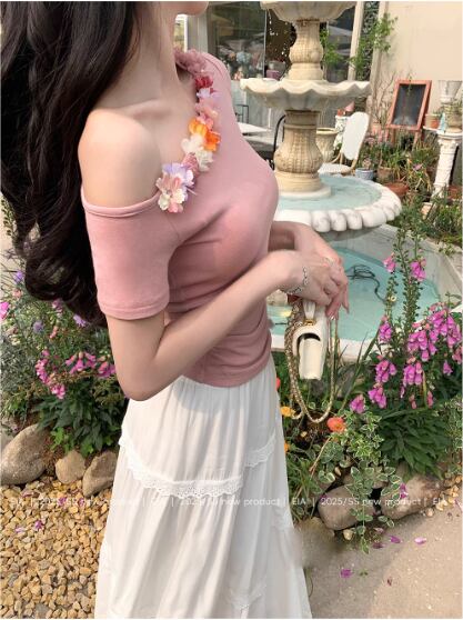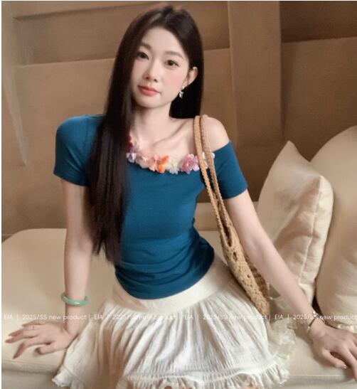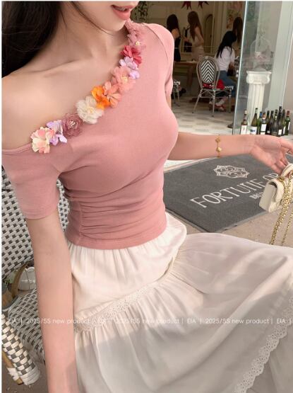 夏用半袖Tシャツ 立体的な優しいウエストと細見えショルダーニットセータートップス23