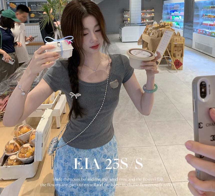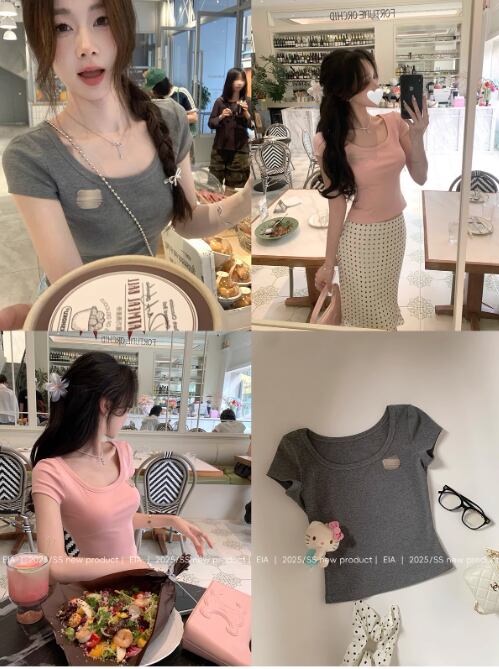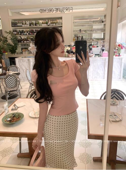 レディース 夏 韓国風 Uネック 半袖 Tシャツ、 スリム薄手 トップス 40