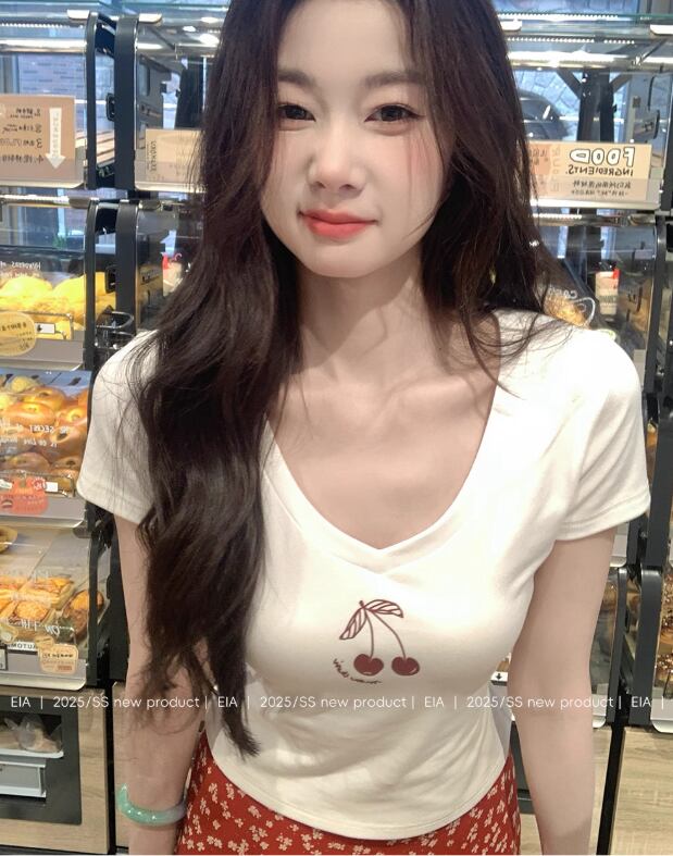 レディース 韓国風 ショルダー Vネック 半袖 Tシャツ レディース 夏プ リントショート スリム 41