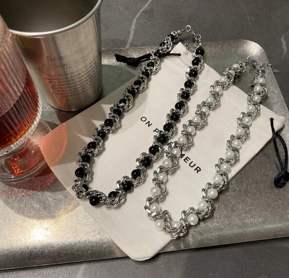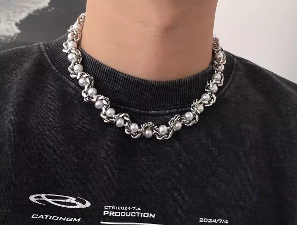 厚みがあり、丈夫なフェイクパールで包まれたチタン鋼のメンズ チョーカー ネックレス、ニッチなデザイン、鎖骨チェーン876